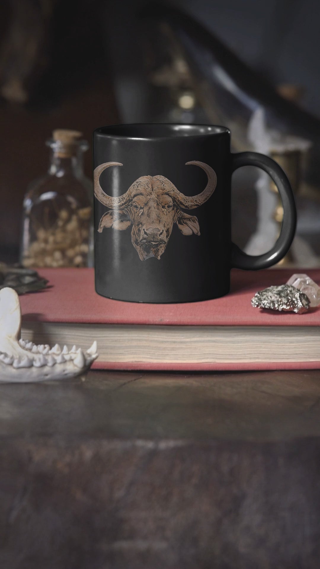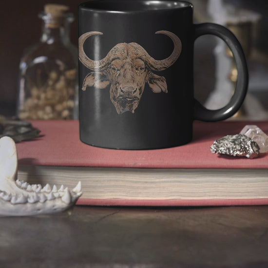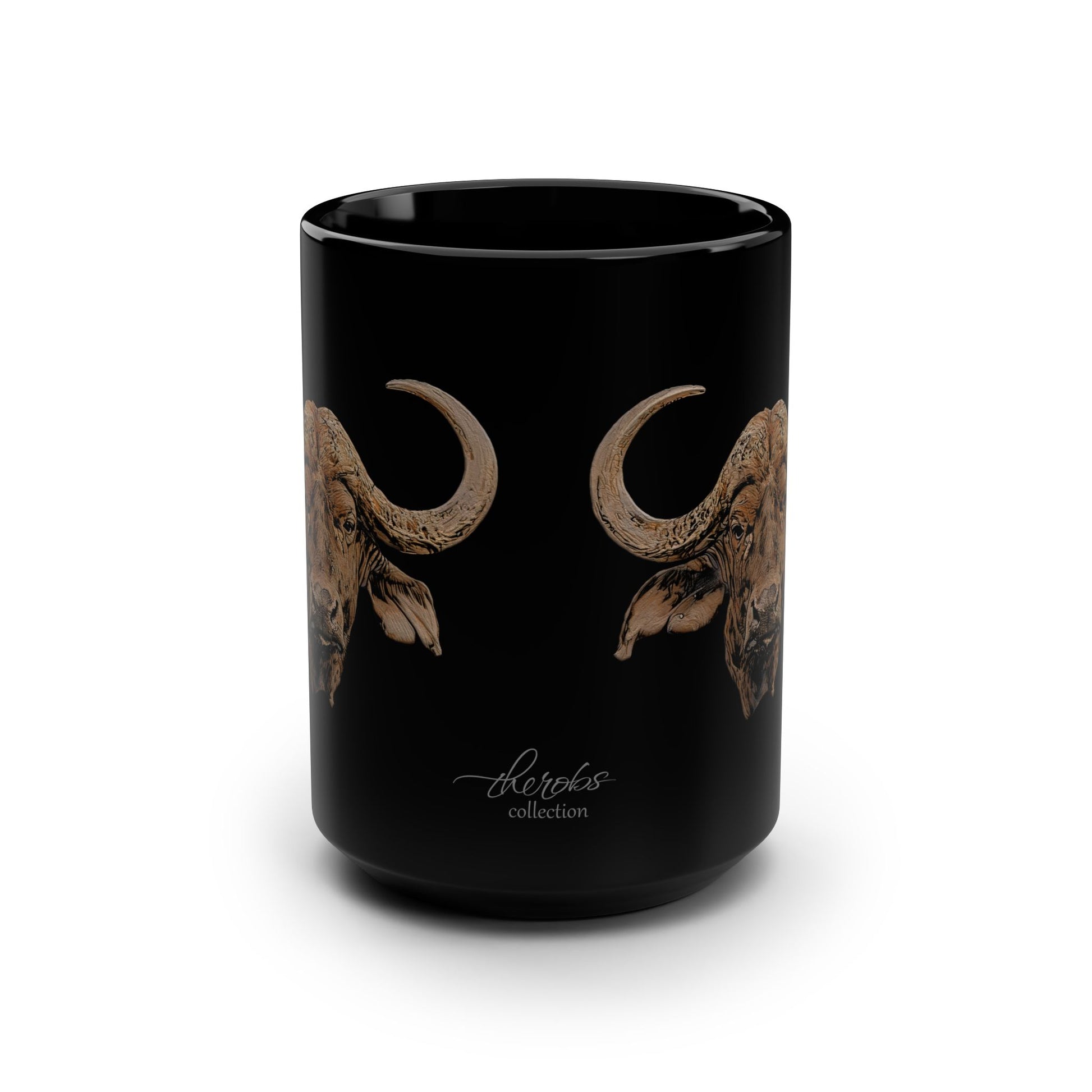 Treat yourself or surprise a loved one with our stunning 15oz large black mug, featuring an illustration of an African Cape Buffalo from the therobs Wildlife Collection. Made from premium glossy ceramic, this mug not only presents a chic and modern design but also displays a captivating image of the majestic Cape Buffalo. Perfect for enjoying your morning coffee or savouring evening hot chocolate, this mug brings a touch of adventure and wild sophistication to your everyday routine.