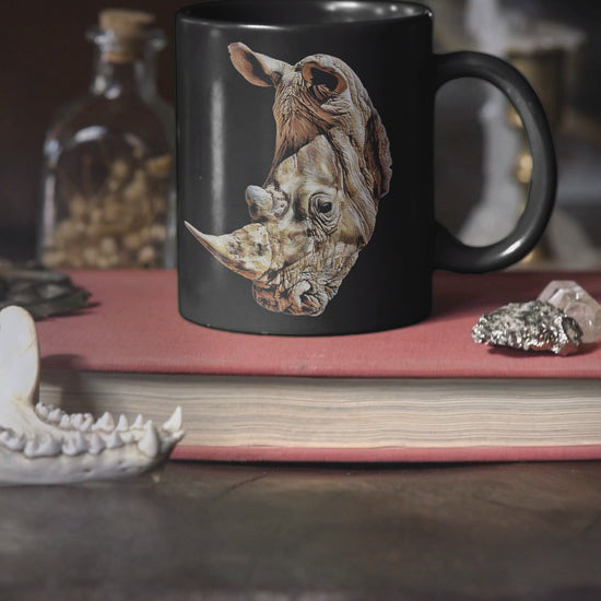 Treat yourself or surprise a loved one with our stunning 15oz large black mug, featuring an illustration of an African Rhino from the therobs Wildlife Collection. Made from premium glossy ceramic, this mug not only presents a chic and modern design but also displays a captivating image of the powerful Rhino. Perfect for enjoying your morning coffee or savouring evening hot chocolate, this mug brings a touch of adventure and wild sophistication to your everyday routine.